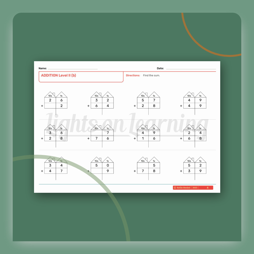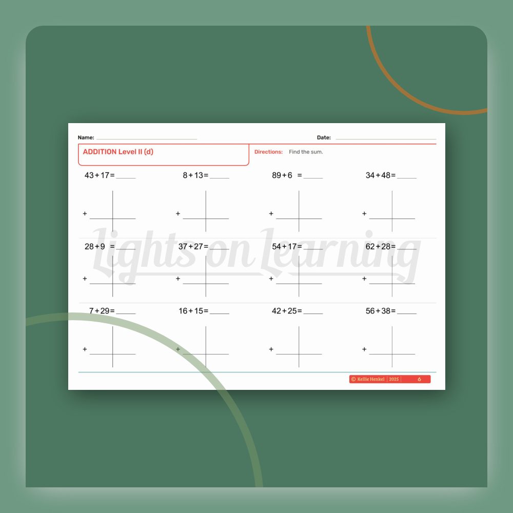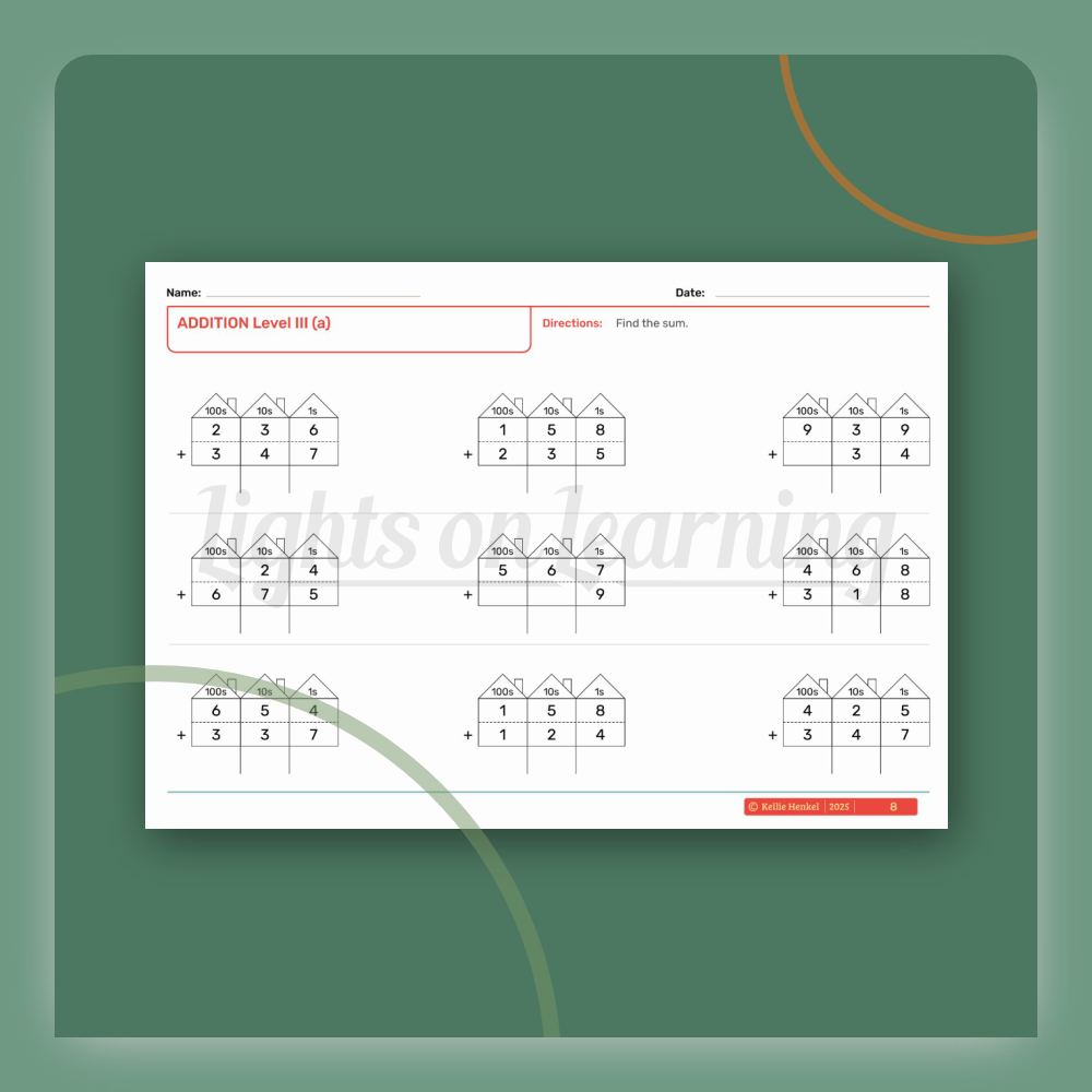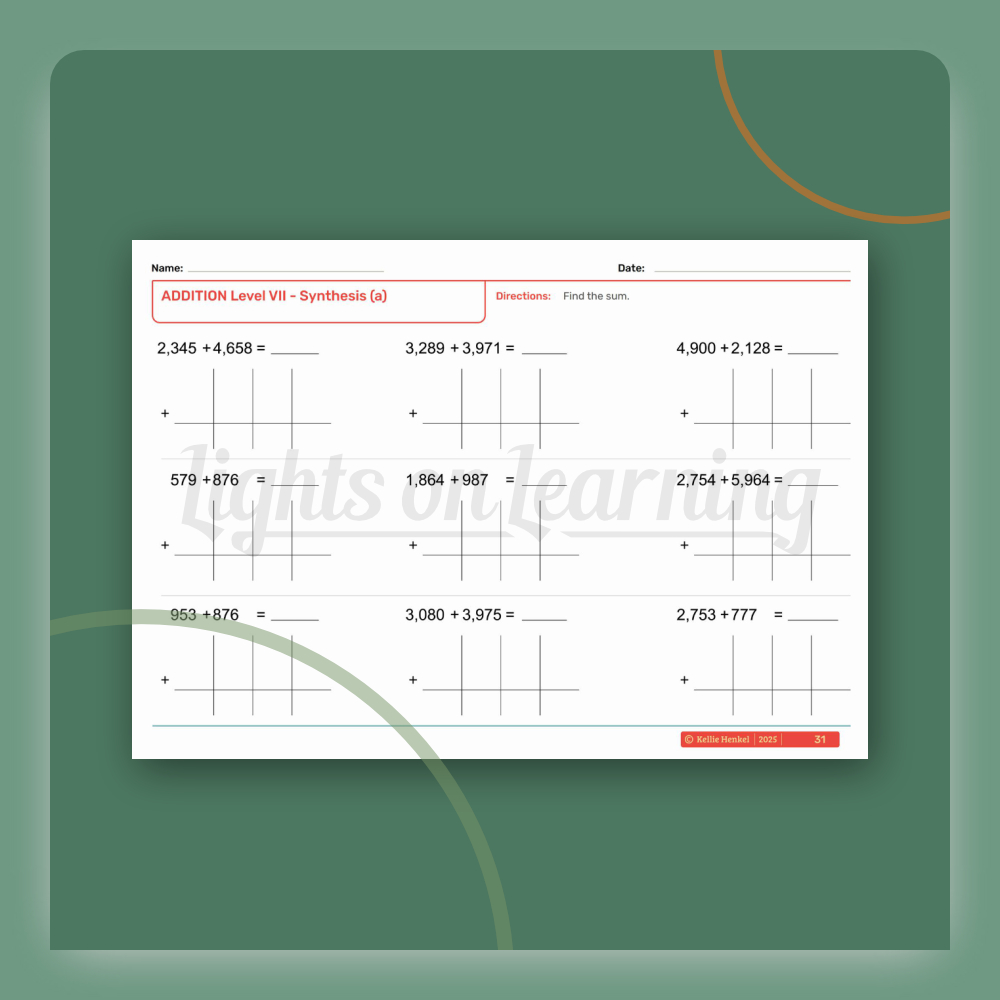 This book will help the student learn to add 4 digits + 4 digits with renaming and build every increment to that level. Perfect for students in 2nd grade and beyond who have mastered their addition facts. This book includes levels 1-7 and includes over 35 pages of application practice in addition to teacher answer sheets.