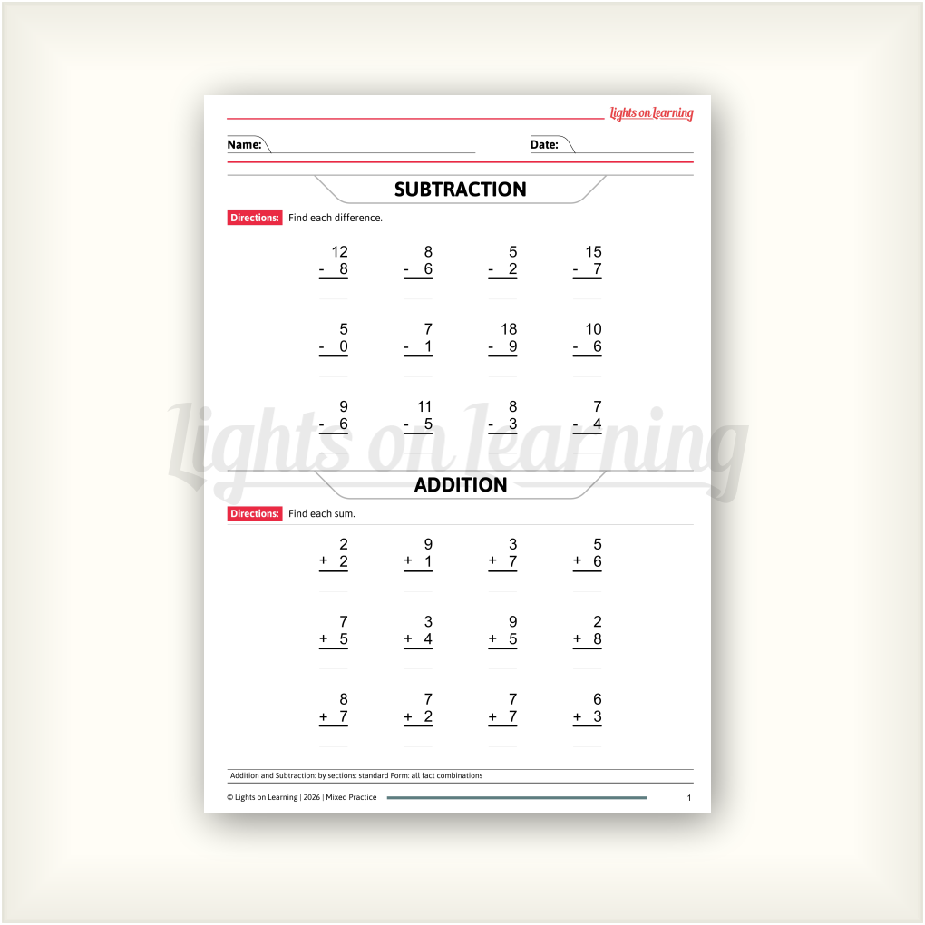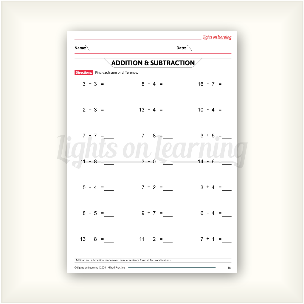 Mixed practice can be challenging because it requires the child to shift their picture from addition to subtraction. This ebook helps the child gradually and successfully shift their picture starting with single digit facts moving gradually to 3-4 digit problems.