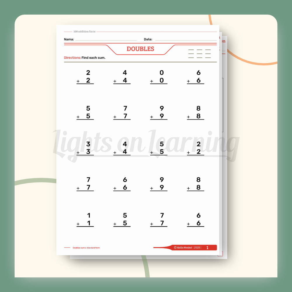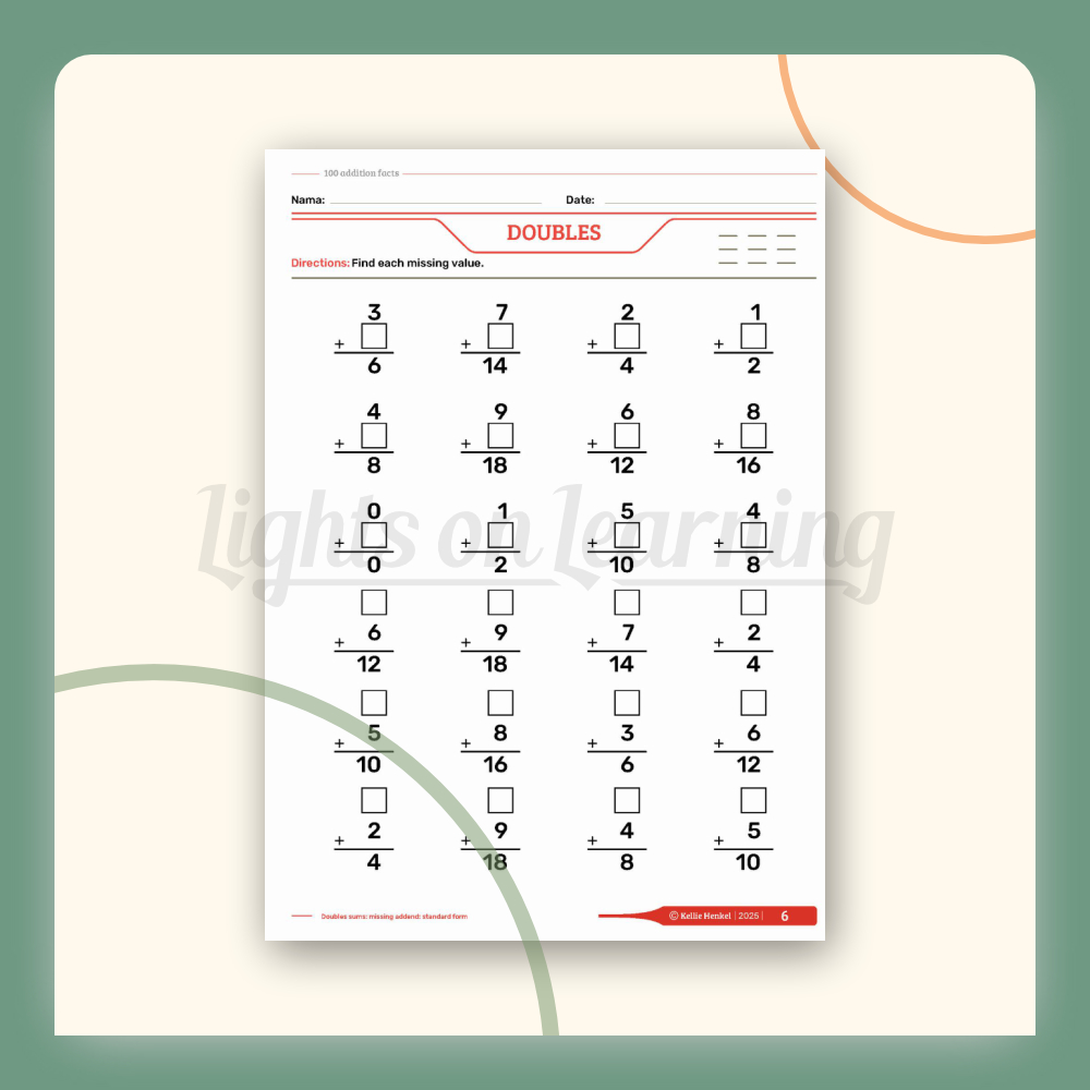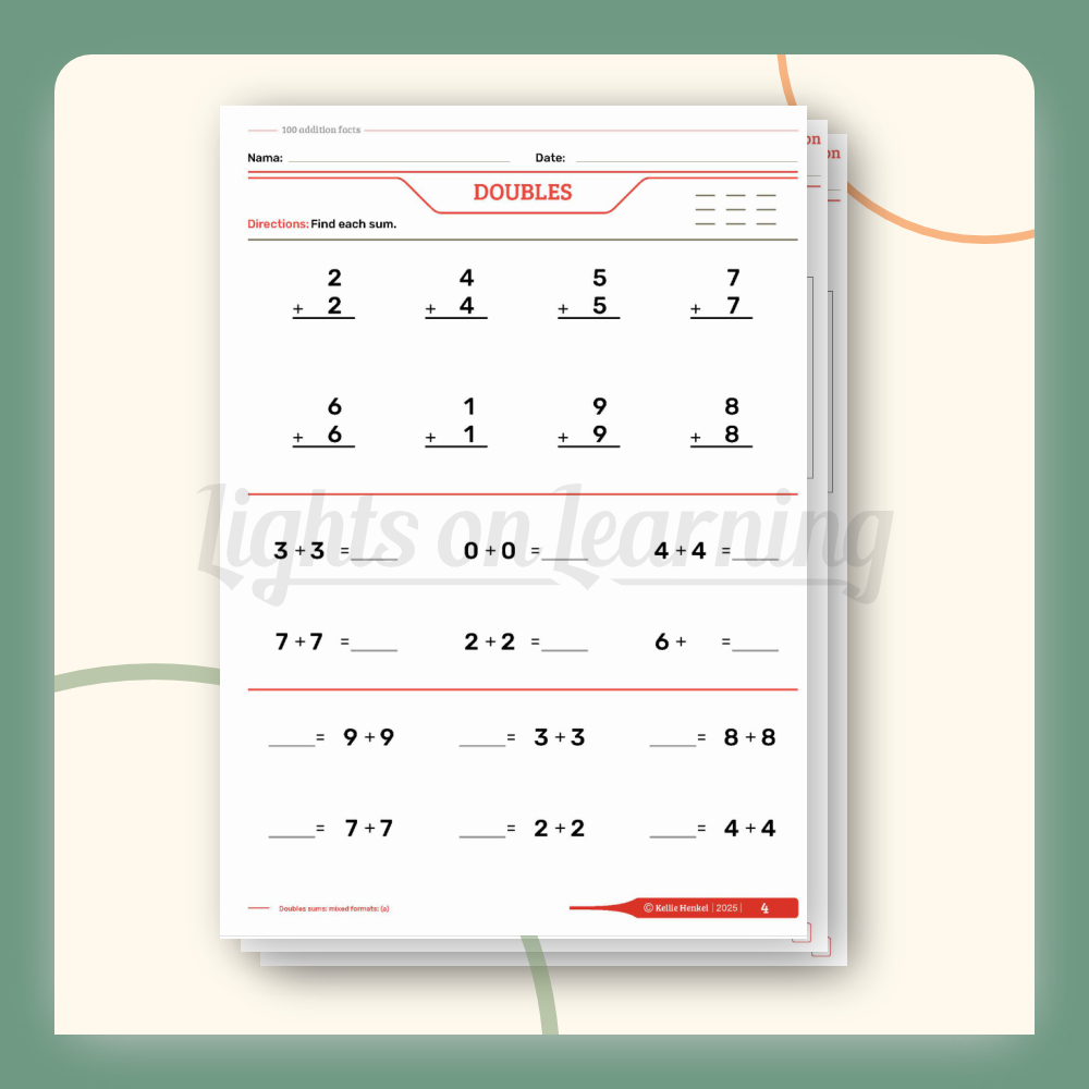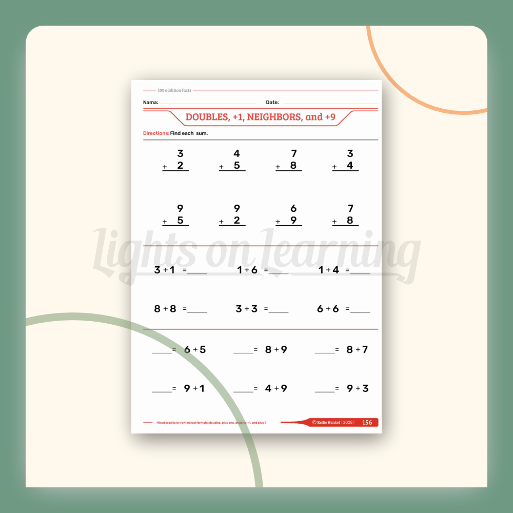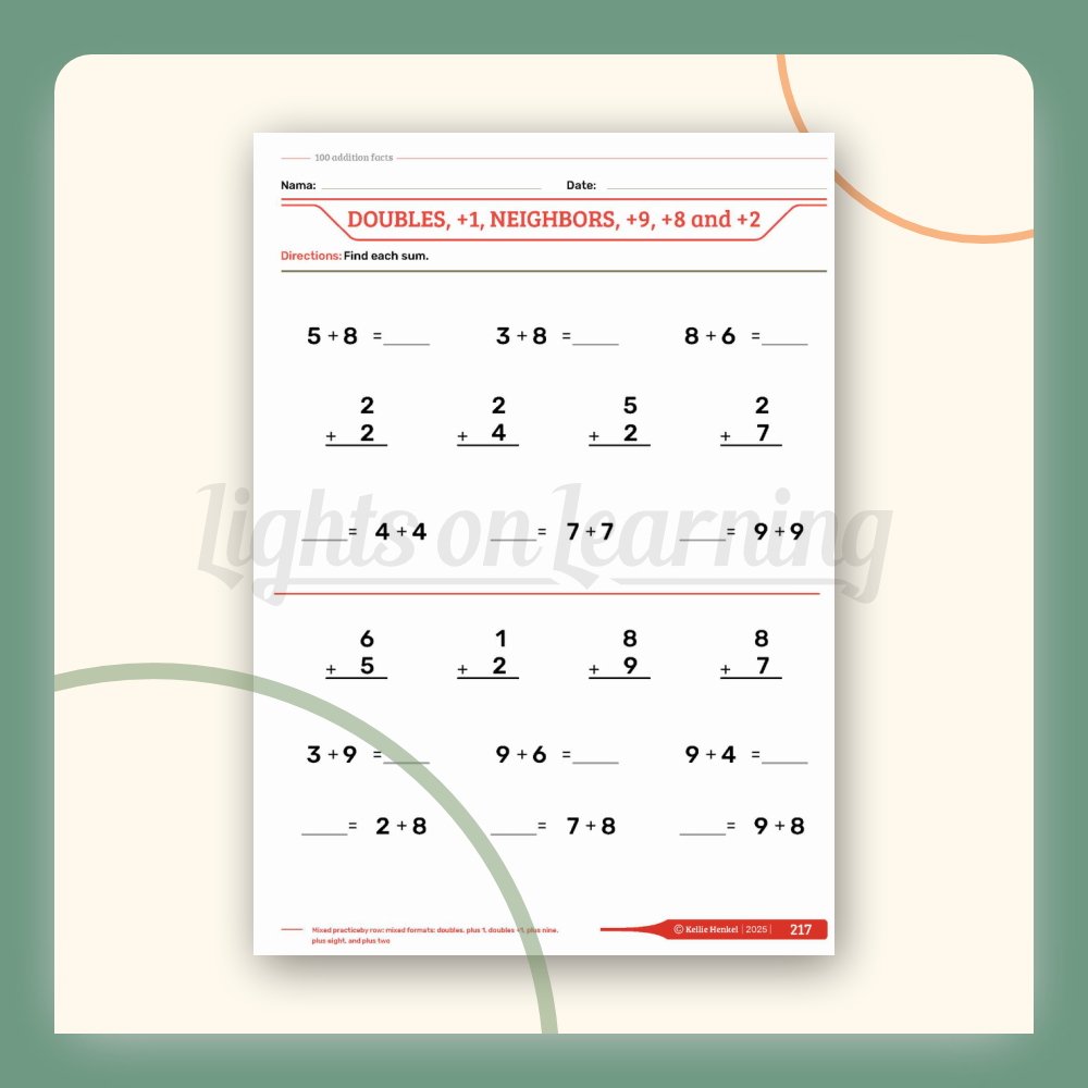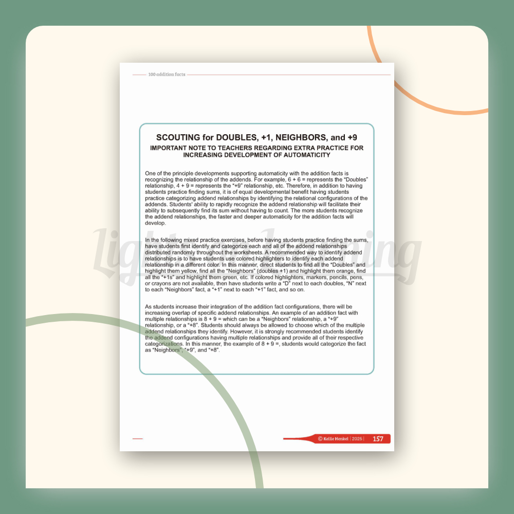 This book will help students to develop automaticity with the 100 addition facts. This book includes over 300 pages using organizing systems of each addition fact to mentally combine all of the 100 addition facts with maximum efficiency and minimum cognitive demand. This book incudes the following addition clubs: doubles, plus 1, neighbors, plus 10, plus 9, plus 8, plus 2, doubles in between, odd balls, partners to 10, adding three addends in addition to mixed practice. This book will help the student learn their addition facts mentally with ease which will eliminate the need to count on your fingers!
